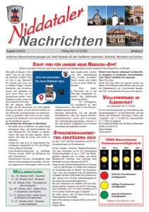 Amtliches Bekanntmachungsorgan der Stadt Niddatal mit den Stadtteilen Assenheim, Bönstadt, Ilbenstadt und Kaichen Freitag, den 13.10.2023 Niddataler Nachrichten d e Ausgabe 20/2023 Jahrgang 5 M ÜLLABHOLUNG Do., 19. Oktober 2023 - Restmüll Fr., 20. Oktober 2023 - Bioabfall Mi., 25. Oktober 2023 - Tonnentausch falls erforderlich Do., 26. Oktober 2023 - Gelbe Tonne in Assenheim und Kaichen Fr., 27. Oktober 2023 - Gelbe Tonne in Bönstadt und Ilbenstadt Fr., 27. Oktober 2023 - Altpapier in allen Stadtteilen s tart frei fÜr uNsere Neue N iddatal -a PP ! Einfach und direkt: Innovative App bringt Neuigkeiten aus Niddatal direkt auf das Smartphone der Bürgerinnen und Bürger! App angebunden werden und dort selbstständig neue Inhalte einstellen. Damit werden alle Inhalte im Ort an einer Stelle ge- bündelt. - Eine digita- le Pinnwand, die in der Orts-App eingebettet ist, ersetzt das traditionelle „Schwarze Brett“. - Ein Umfragemo- dul ermöglicht es allen Ortsbewohnern, sich aktiv in das Gemein- deleben einzubringen. - Wichtige Dokumente, wie der aktuelle Abfallkalender oder der neuste Gemein- deratsbeschluss, sowie auch Formulare, wie Adressänderungsanträge, können in der App einfach zugänglich zum sicheren Download bereitgestellt werden. Einfach den Namen „Niddatal“ im App Sto- re eingeben & kostenfrei herunterladen. Link: https://niddatal.orts.app/app Über Orts-App Hinter Orts-App steht die apicodo GmbH aus Mainz. Ein Software-Unternehmen, das sich auf die Digitalisierung von Communities speziali- siert hat: www.apicodo.de & www.orts-app.de Was gibt es Neues in Nid- datal? Wie ist der Stand bei welchem Projekt? Was tut sich in den Vereinen? Für solche und noch vie- le weitere Fragen müssen Anwohner und Anwohne- rinnen von Niddatal nur noch einen Blick auf ihr Smartphone werfen – denn Niddatal ist jetzt online mit einer eigenen Orts-App! Mit der eigenen Nidda- tal-App hat die Gemeinde nun eine digitale Lösung zur Hand, um die Kommunikation im Ort effizienter, ansprechender und übersicht- licher zu gestalten. Aber nicht nur das: Insbe- sondere die Menschen und Gemeinschaften im Ort profitieren davon! Die Vorteile der Orts-App im Überblick: - Sie bietet einen einfachen und gleichzeitig wirksamen Weg, die Kommunikation mit allen Bürgerinnen und Bürger zu digitali- sieren: Als App auf dem eigenen Smart- phone. Die App ist intuitiv und leicht zu bedienen. - Inhalte der App sind im sogenannten Ka- cheldesign dargestellt und für alle Bürge- rinnen jederzeit abrufbar. - Push-Benachrichtigungen zu wichtigen Themen landen direkt als Mitteilung auf dem Smartphone. - Sportvereine, Schulen, Kindergärten oder andere Interessengemeinschaften, können als sogenannte Ortsgruppen direkt an die Für die Abschlussarbeiten zur Erschließung des Gewerbegebiets I11 „An der Steinkaute“ wird die Straße „Am Steinacker“ letztmalig in Höhe „Am Lohgraben“ vom 11.10.2023 bis voraussichtlich 01.11.2023 voll gesperrt. Die Umleitung erfolgt über die Burg-Gräfenröder Straße und die B 45. Stadt Niddatal Ordnungsamt V ollsPerruNg iN i lBeNstadt „Am Steinacker“ ab 11.10.2023 Derzeit erfolgen zwischen Niddatal/Assenheim und dem Anschluss zur B 275 umfangreiche Straßenbauarbeiten an der L 3187. Die Bautä- tigkeiten befinden sich im dritten und letzten Bauabschnitt zwischen dem Abzweig nach Wickstadt und dem Abzweig der B 275. Aufgrund der Schlechtwetterperiode im Sommer - und vor allen Dingen im Vorfeld nicht absehba- rer Zusatzleistungen im Bereich der Entwässe- rung - kann das anvisierte Ende der Maßnahme im späten Oktober 2023 leider nicht erreicht wer- den. Aktuell wird mit einer Verkehrsfreigabe für die zweite Novemberhälfte gerechnet. Bis zum Abschluss der Arbeiten wird der über- örtliche Verkehr weiterhin auf der B 3-Ortsumge- hung Wöllstadt und K 24 über Friedberg zur B 275 in beiden Fahrtrichtungen umgeleitet. Wir bitten darum, sich auf diese Änderung im Planungsablauf einzustellen. Mehr Informationen zu Hessen Mobil unter mobil. hessen.de. Hessen Mobil s trasseNBauarBei - teN VerZÖgerN sich auf der L 3187 zwischen Assenheim und B 275 / Zusatzleistungen bei Entwässerung Okt. OVAG-Wasserampel Trinkwasserverfügbarkeit Nov. Dez. Jan. kritische Grundwasser- verfügbarkeit mäßige Grundwasser- verfügbarkeit gute Grundwasser- verfügbarkeit Weitere Informationen unter www.ovag.de/wasser/wasserampel.html