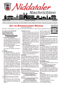 Amtliches Bekanntmachungsorgan der Stadt Niddatal mit den Stadtteilen Assenheim, Bönstadt, Ilbenstadt und Kaichen Freitag, den 12.09.2025 Nachrichten Niddataler Ausgabe 18/2025 Jahrgang 7 Gz.: 2-BD-05-15-52-01-B-0006#006 Flurbereinigungsverfahren Nidderau-Windecken B 45 Verfahrensnummer: UF 1552 Öffentliche Bekanntmachung I. Ausführungsanordnung 1. Anordnung der Ausführung In dem Flurbereinigungsverfahren Nid- derau-Windecken B 45 wird gemäß § 61 des Flurbereinigungsgesetzes (FlurbG) vom 16. März 1976 (BGBl. I S. 546) in der derzeit geltenden Fassung die Ausführung des Flur- bereinigungsplans angeordnet. Der im Flurbereinigungsplan vorgesehene neue Rechtszustand tritt am 29.10.2025 an die Stelle des bisherigen Rechtszustan- des. 2. Hinweise 2.1 Rechtliche Wirkungen Zum Zeitpunkt des Eintritts des neuen Rechtszustandes werden die Teilnehmerin- nen und Teilnehmer Eigentümerinnen bzw. Eigentümer der ihnen durch den Flurbereini- gungsplan zugewiesenen neuen Grundstü- cke. Rechtswirksame Verfügungen können von diesem Zeitpunkt an nur noch über die neuen Grundstücke getroffen werden. Der Inhalt des Grundbuchs wird unrichtig und bedarf der Berichtigung. Nach § 81 Abs. 1 FlurbG dient bis zur Berichtigung des Liegenschaftskatasters der Flurberei- nigungsplan als amtliches Verzeichnis der Grundstücke gemäß § 2 Abs. 2 Grundbuch- ordnung. Die rechtlichen Wirkungen der vorläufigen Besitzeinweisung vom 01.09.2017 enden zu dem oben genannten Zeitpunkt. Die Über- leitungsbestimmungen vom 05.07.2017 der vorläufigen Besitzeinweisung finden nun Anwendung auf diese Ausführungsanord- nung. 2.2 Zeitweilige Einschränkung des Eigen- tums Die nach §§ 34 bzw. 85 Nr. 5 FlurbG festge- setzten zeitweiligen Einschränkungen des Eigentums enden mit dem oben genannten Zeitpunkt. 2.3 Nießbrauch, Pacht Anträge, die Ansprüche nach § 69 FlurbG aus einem Nießbrauchsrecht oder nach § 70 FlurbG aus einem Pachtverhältnis zum Gegenstand haben, sind gem. § 71 FlurbG spätestens drei Monate nach Erlass dieser Ausführungsanordnung bei der Flurberei- nigungsbehörde, dem Amt für Bodenma- nagement Büdingen, Bahnhofstraße 33, 63654 Büdingen, zu stellen. Der Lauf der Frist beginnt mit dem ersten Tag der öffentli- chen Bekanntmachung. 3. Bekanntmachung Diese Ausführungsanordnung wird in der Flurbereinigungsgemeinde Nidderau und in den angrenzenden Gemeinden Schöneck, Hammersbach, Altenstadt, Limeshain und in den Städten Bruchköbel und Niddatal öf- fentlich bekannt gemacht. Darüber hinaus ist die Ausführungsanord- nung über die Internetadresse https://www. hvbg.hessen.de/UF1552 abrufbar. Begründung Der Flurbereinigungsplan des Flurbereinigungs- verfahrens Nidderau-Windecken B 45 hat vom 06.12.2023 bis zum 07.12.2023 sowie am 13.12.2023 zur Einsichtnahme für die Beteilig- ten offengelegen. Der Anhörungstermin gemäß § 59 Abs. 2 FlurbG fand am 18.12.2023 statt. Widersprüche gegen den bekanntgegebenen Flurbereinigungsplan wurden nicht erhoben. Der Flurbereinigungsplan ist somit unanfecht- bar. Die rechtlichen Voraussetzungen zum Er- lass der Ausführungsanordnungen liegen somit vor. Rechtsbehelfsbelehrung Gegen diese Ausführungsanordnung kann in- nerhalb eines Monats nach seiner Bekanntgabe Widerspruch erhoben werden beim Amt für Bodenmanagement Büdingen - Flurbereinigungsbehörde - Bahnhofstraße 33, 63654 Büdingen oder beim Hessischen Landesamt für Bodenmanage- ment und Geoinformation - Obere Flurbereinigungsbehörde - Schaperstraße 16, 65195 Wiesbaden. Der Widerspruch kann schriftlich oder zur Nie- a mt fÜr B odeNmaNagemeNt B ÜdiNgeN - Flurbereinigungsbehörde - Bahnhofstr. 33 · 63654 Büdingen · Tel.-Nr.: 0611 535-7000 · Fax-Nr.: 0611 327605-100 · E-Mail: info.afb-buedingen@hvbg.hessen.de derschrift erhoben werden. Der Lauf der Widerspruchs- frist beginnt mit dem ersten Tag der öffentlichen Be- kanntmachung. II. Anordnung der sofortigen Vollziehung Anordnung Die sofortige Vollziehung dieser Ausführungs- anordnung wird nach § 80 Abs. 2 Satz 1 Nr. 4 der Verwaltungsgerichtsordnung (VwGO) in der jeweils geltenden Fassung, angeordnet mit der Folge, dass die aufschiebende Wirkung von Wi- dersprüchen aufgehoben wird. Begründung Die sofortige Vollziehung der Ausführungsan- ordnung wird angeordnet, da diese im öffentli- chen Interesse und im überwiegenden Interesse aller Beteiligten liegt. Eine weitere Verzögerung der Berichtigung der öffentlichen Bücher (z. B. Grundbuch) und der damit verbundenen Rechtsunsicherheiten kann nicht länger zuge- mutet werden. Somit überwiegen das öffentli- che Interesse sowie das gemeinschaftliche und wirtschaftliche Interesse der Beteiligten mög- licher entgegenstehender Interessen einzelner Beteiligter. Die rechtlichen Voraussetzungen für die Anordnung der sofortigen Vollziehung sind somit gegeben. Rechtsmittelbelehrung Nach § 80 Abs. 5 Verwaltungsgerichtsordnung kann auf Antrag der Hessische Verwaltungsgerichtshof - Flurbereinigungsgericht - Goethestraße 41+43, 34119 Kassel die aufschiebende Wirkung des Widerspruchs ganz oder teilweise wiederherstellen. Dieser Antrag ist schriftlich zu stellen oder zu Protokoll des Urkundsbeamten der Geschäftsstelle zu er- klären. Datenschutz Die Datenschutzerklärung für das Flurberei- nigungsverfahren kann im Internet unter der Internetadresse https://hvbg.hessen.de/daten- schutz eingesehen werden. Büdingen, den 03.09.2025 Amt für Bodenmanagement Büdingen - Flurbereinigungsbehörde - gez. Dr. Schweitzer, Amtsleiter