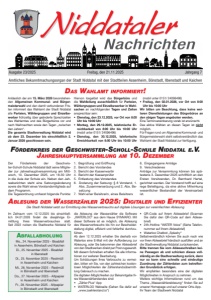 Amtliches Bekanntmachungsorgan der Stadt Niddatal mit den Stadtteilen Assenheim, Bönstadt, Ilbenstadt und Kaichen Freitag, den 21.11.2025 Nachrichten Niddataler Ausgabe 23/2025 Jahrgang 7 a BlesuNg der w asserZÄhler 2025: d igitaler uNd e ffiZieNter Die Stadt Niddatal setzt zur Ermittlung des Wasserverbrauchs auf digitale Lösungen zur vereinfachten Ablesung 07 2 B ekanntgaBe des W ahltages und des t ages der s tichWahl sowie Aufforderung zur Einreichung von Wahlvorschlägen für die Direktwahl der Bürgermeisterin oder des Bürgermeisters der Stadt Niddatal (Hessen) Zusätzliche Informationen zur Stelle können bei nachfolgender Adresse erfragt werden: Wahlleitung der Stadt Niddatal Besonderer Wahlleiter Herr Andreas Schwenz Zimmer Nr.: 2.04, Telefonnummer: 06034/ 9124-240, E-Mail-Adresse: wahl@niddatal.de Rathaus Niddatal, Im Kloster 6, 61194 Niddatal, 2. Die Wahl findet nach dem Beschluss der Stadtverordnetenversammlung der Stadt Niddatal vom 02.07.2025 am Sonntag, den 15.03.2026, und eine evtl. Stichwahl am Sonn- tag, den 29.03.2026, statt. 3. Hiermit fordere ich zur Einreichung von Wahl- vorschlägen für die Bürgermeisterwahl auf. Die Wahl erfolgt auf Grund von Wahlvorschlä- gen, die den gesetzlichen Erfordernissen der §§ 10 bis 13, 41 und 45 KWG entsprechen. Wahlvorschläge können von Parteien im Sinne Fortsetzung auf Seite 2 2. Hessisches Kommunalwahlgesetz (KWG) in der Fassung der Bekanntmachung vom 07.03.2005 (GVBl. I S. 197), zuletzt ge- ändert durch Artikel 3 des Gesetzes vom 01.04.2025 (GVBl. 2025 Nr. 24). 3. Kommunalwahlordnung (KWO) in der Fas- sung vom 26.03.2000 (GVBl. I S. 198, 233), zuletzt geändert durch Verordnung vom 10.04.2025 (GVBl. 2025 Nr. 25). Wählbar zur Bürgermeisterin/ zum Bürger- meister sind Deutsche im Sinne des Art. 116 Abs. 1 des Grundgesetzes und Unionsbürger, die am Wahltag das 18. Lebensjahr vollendet haben. Für den Ausschluss von der Wählbar- keit gelten § 32 Abs. 2 und § 31 HGO entspre- chend. Die Bewerbung für die zu besetzende Stelle muss in Form eines Wahlvorschlags erfolgen, auf dessen gesetzliche Erfordernisse nach- folgend unter Ziffer. 3 nochmals hingewiesen wird. Eine gesonderte Bewerbung ist wahl- r echtlich weder erforde rlich noch ausreichend. 1. In der Stadt Niddatal mit 9.861 Einwohner ist die hauptamtliche Stelle der Bürger- meisterin oder des Bürgermeisters ab dem 01.07.2026 im Wege der Direktwahl neu zu besetzen. Die Stelle ist gemäß der Hessischen Kom- munalbesoldungsverordnung nach Besol- dungsgruppe A 16 bewertet. Zusätzlich wird eine Dienstaufwandsentschädigung nach § 6 der Verordnung über die Besol- dung, Dienstaufwandsentschädigung und Reisekostenpauschale der hauptamtlichen kommunalen Wahlbeamtinnen und Wahl- beamten auf Zeit (KomBesDAV) gewährt. Die Amtszeit beträgt sechs Jahre. Für die Bürgermeisterwahl gelten die fol- genden gesetzlichen Bestimmungen: 1.Hessische Gemeindeordnung (HGO) in der Fassung der Bekanntmachung vom 07.03.2005 (GVBl. I S. 142), zuletzt ge- ändert durch Artikel 1 des Gesetzes vom 01.04.2025 (GVBl. 2025 Nr. 24). d as W ahlamt informiert ! Anlässlich der am 15. März 2026 bevorstehen- den Allgemeinen Kommunal- und Bürger- meisterwahl und den damit verbundenen Fris- ten informiert das Wahlamt der Stadt Niddatal alle Parteien, Wählergruppen und Einzelbe- werber frühzeitig über geänderte Sprechzeiten des Wahlamtes und des Bürgerbüros vor und nach Weihnachten sowie den Tagen „zwischen den Jahren“. Die gesamte Stadtverwaltung Niddatal wird ab dem 23. Dezember bis einschließlich 2. Januar 2026 geschlossen sein. In der Stadt Niddatal haben Bürgerinnen und Bürger nun die Möglichkeit, bei der Beantra- gung eines Ausweisdokumentes ein digitales Lichtbild direkt in der Verwaltung aufnehmen zu lassen. Die Aufnahme erfolgt unkompli- ziert an einem Selbstbedienungsterminal, das sich im Bürgerbüro der Stadtverwaltung be- findet. Das Foto wird umgehend in das An- tragsverfahren integriert, sodass kein eige- d igitale l ichtBilder im B ÜrgerBÜro n iddatal Bürger können jetzt unkompliziert digitale Lichtbilder für Ausweisdokumente direkt im Bürgerbüro aufnehmen lassen. Hiervon losgelöst wird das Bürgerbüro und die Wahlleitung ausschließlich für Parteien, Wählergruppen und Einzelbewerber in Wahl- sachen an nachfolgenden Tagen und Zeiten ansprechbar sein: • Dienstag, den 23.12.2025, vor Ort von 8:00 Uhr bis 10:00 Uhr • Montag, den 29.12.2025, telefonische Er- reichbarkeit von 8:00 Uhr bis 10:00 Uhr (mobil unter 0151/ 24096496) • Dienstag, den 30.12.2025, telefonische Erreichbarkeit von 8:00 Uhr bis 10:00 Uhr (mobil unter 0151/ 24096496) • Freitag, den 02.01.2026, vor Ort von 8:00 Uhr bis 10:00 Uhr Wir bitten um Beachtung, dass keine wei- teren Dienstleistungen des Bürgerbüros an den obigen Tagen angeboten werden. Eine Terminvereinbarung vorab ist erwünscht. Das aktive Wählen an diesen Tagen ist nicht möglich. Für Fragen rund um Allgemeine Kommunal- und Bürgermeisterwahl steht selbstverständlich das Wahlamt der Stadt Niddatal zur Verfügung. nes Passfoto mitgebracht werden muss. Für die Nutzung des Fototerminals wird ein zu- sätzliches Zeitfenster reserviert. Bitte geben Sie bei der Terminvereinbarung (telefonisch oder online) mit an, ob ein digitales Lichtbild in der Verwaltung erstellt werden soll. Die Gebühr für die digitale Aufnahme beträgt 6,00 Euro. Es ist zu beachten, dass Fotos von Babys nur möglich sind, wenn diese eigenständig sitzen können. Die Nutzung des Fototerminals ist freiwillig; Bür- ger haben weiterhin die Möglichkeit, ein eigenes digitales Lichtbild in Form eines QR-Codes mit- zubringen. Hinweis: Eine gedruckte Passbildaufnahme kann nicht mehr verwendet werden und ist so- mit nicht mehr zulässig. Diese Neuerung erleichtert den Antragsprozess und spart Zeit. f ÖrderKreis d r g eschwister -s choll -s chule N iddatal e .V. J ahreshauPtVersammluNg am 10. d eZemBer De För rkreis der Geschwis ter-Scholl-Schule Ni datal 